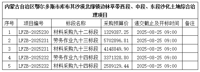 內(nèi)蒙古自治區(qū)鄂爾多斯市庫布其沙漠北緣鎖邊林草帶西段、中段、東段沙化土地綜合治理項目--勞務作業(yè)、材料采購5個標段比選公告