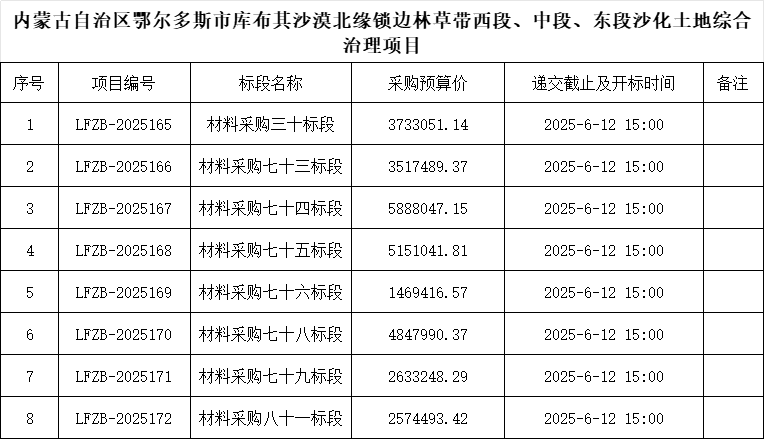 內(nèi)蒙古利凡工程項目管理有限公司受鄂爾多斯市水投惠源建設(shè)有限公司的委托,采用比選的方式,對內(nèi)蒙古自治區(qū)鄂爾多斯市庫布其沙漠北緣鎖邊林草帶西段、中段、東段沙化土地綜合治理項目--材料采購8個標(biāo)段進行采購,歡迎符合資格條件的應(yīng)選人前來參加: