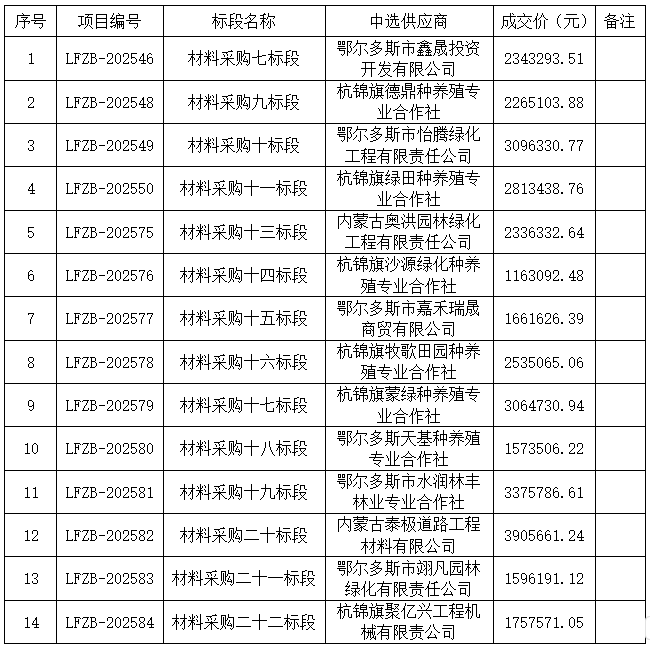 內(nèi)蒙古自治區(qū)鄂爾多斯市庫(kù)布其沙漠北緣鎖邊林草帶西段、中段、東段沙化土地綜合治理項(xiàng)目--材料采購(gòu)七、九至十一、十三至二十二標(biāo)段中選結(jié)果公告